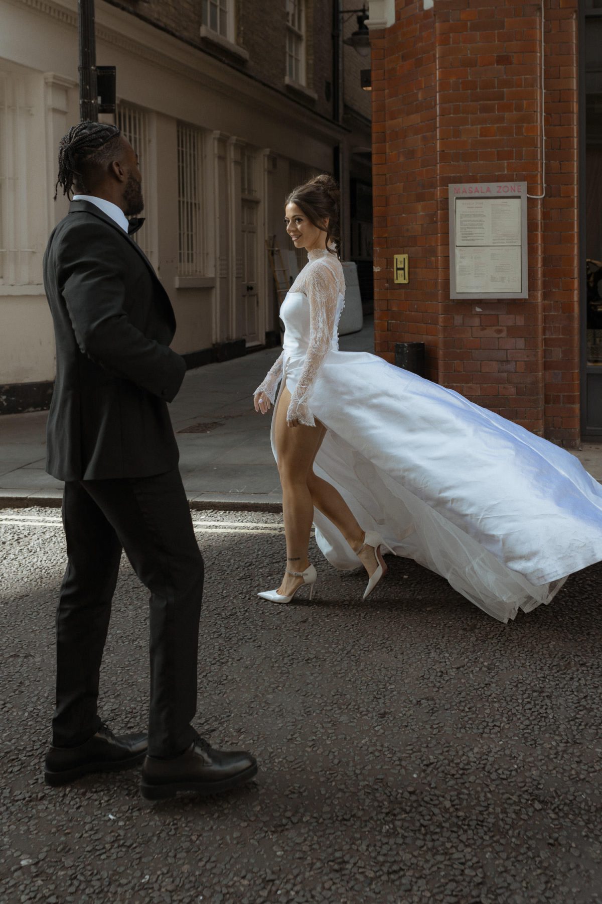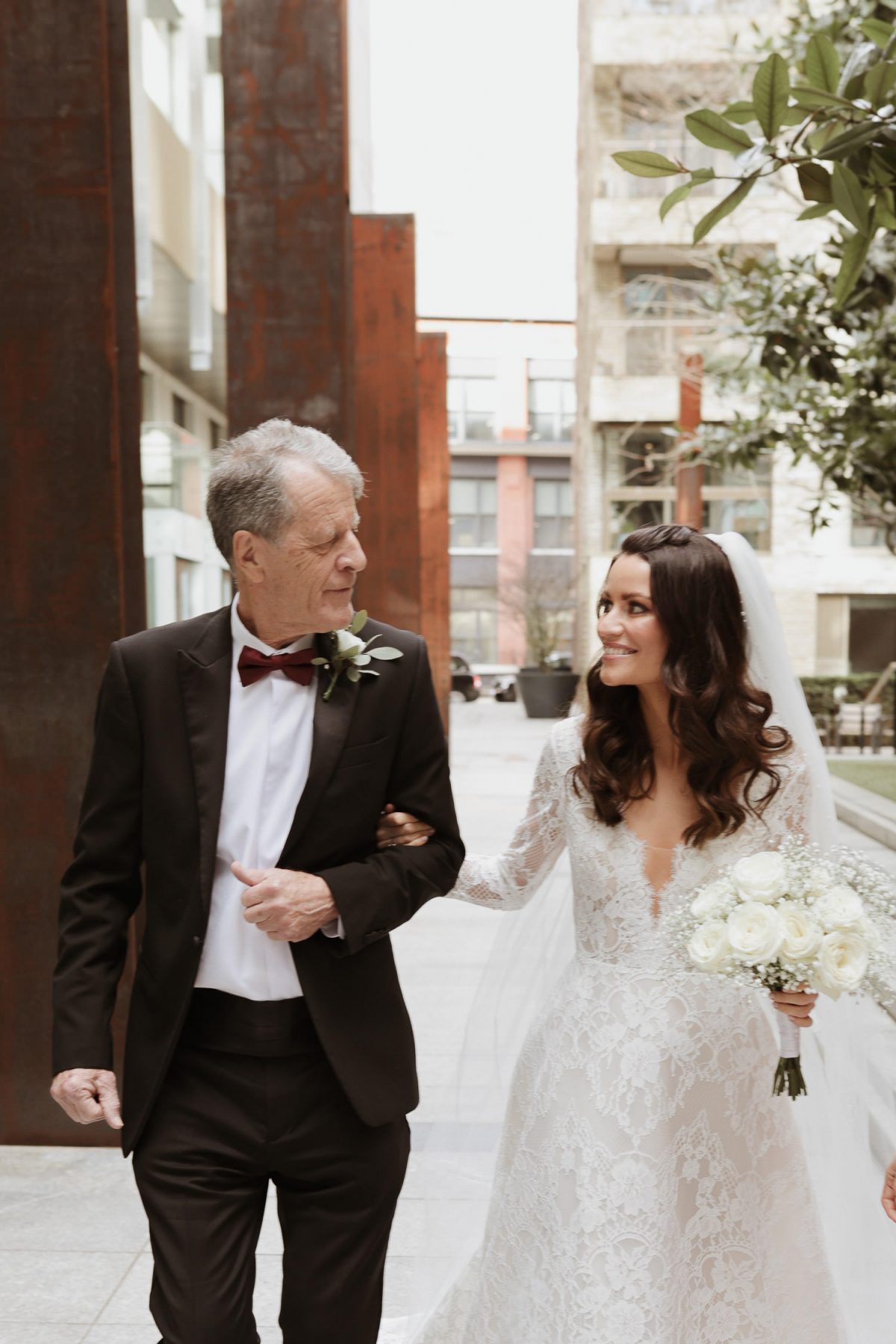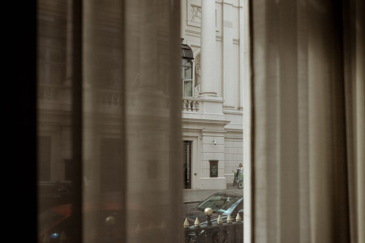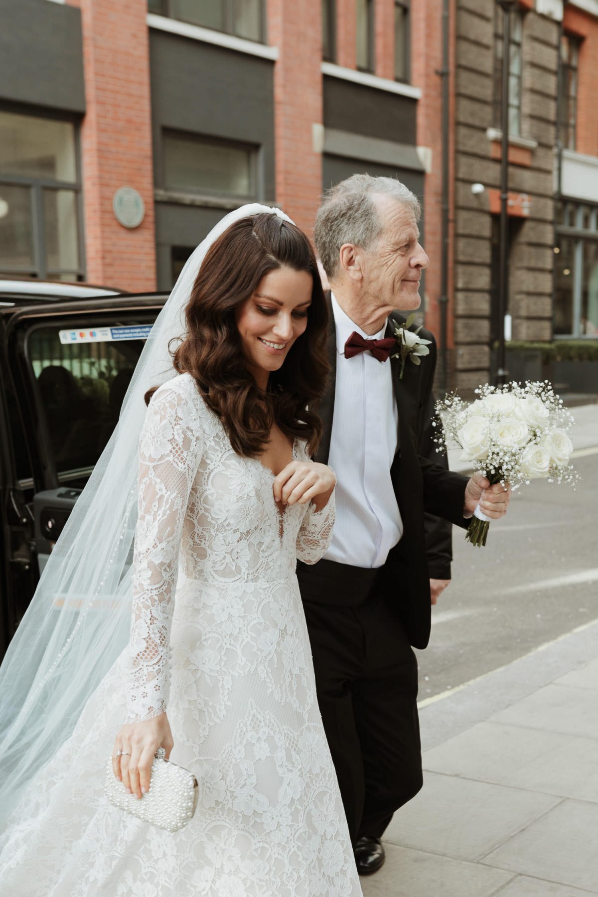 bride is being helped getting off the car for fitzrovia chapel wedding Bride and dad walking down to Fitzrovia chapel wedding bride and bridesmaids walking down to fitzrovia chapel wedding a bride with her veil on in Fitzrovia chapel wedding Cotswolds-wedding-photographer-barcelona-wedding Piccadilly circus seen from a bus groom is getting ready against window at No Mad London hotel